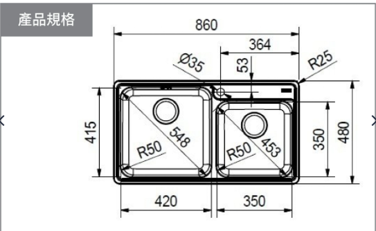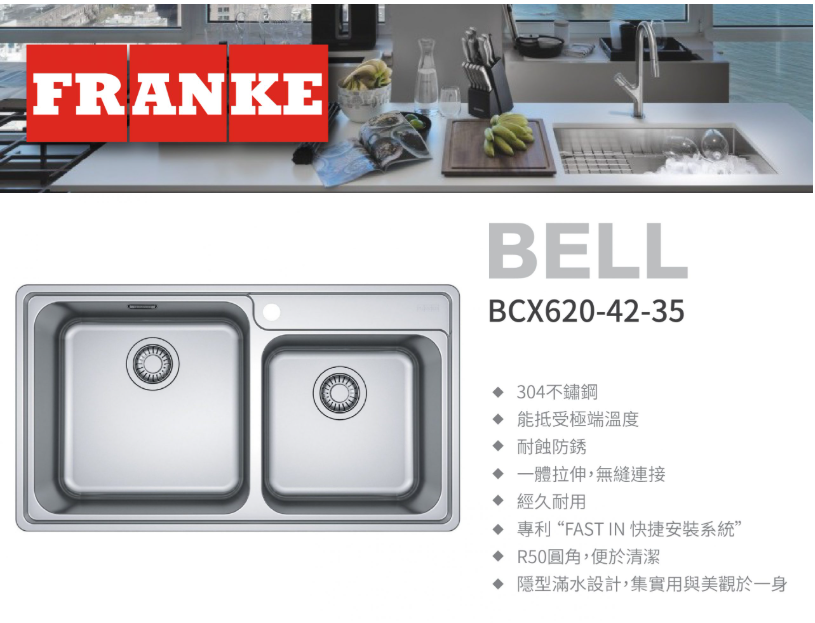 瑞士 FRANKE BELL BCX620-42-35 不鏽鋼大小雙膽平邊檯面廚盆 860x480x200mm