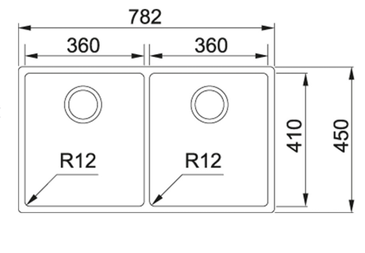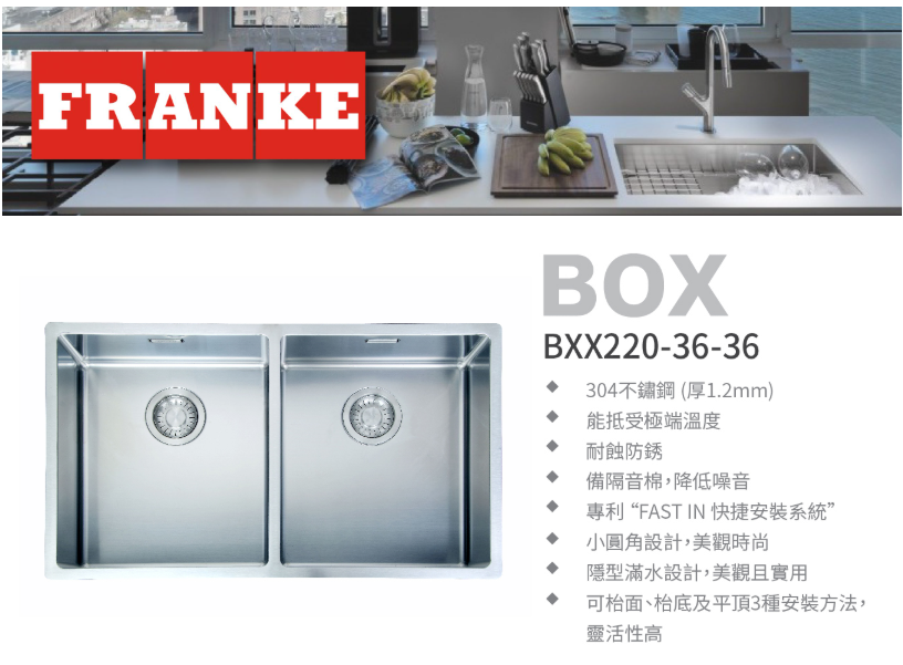 瑞士 FRANKE BOX BXX220-36-36 不鏽鋼雙膽平邊廚盆 782x450x200mm (檯面/底/平頂)