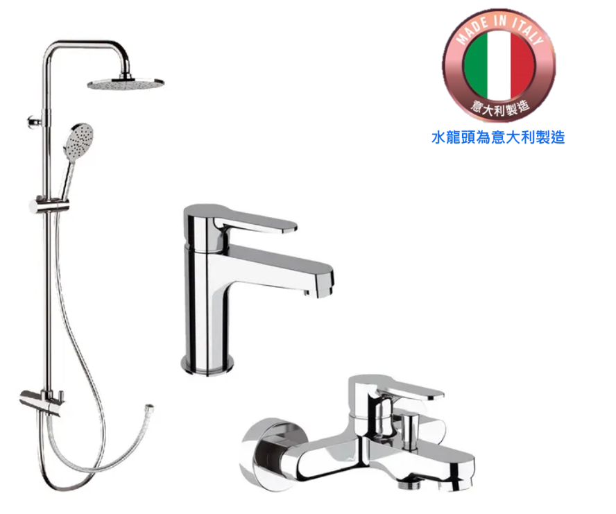 | 型號 | 面盆龍頭:W11 (意大利製造) 浴缸龍頭:W05 (意大利製造) 雨淋花灑連手持花灑 (可調高低):330A8MPEC20NRA |