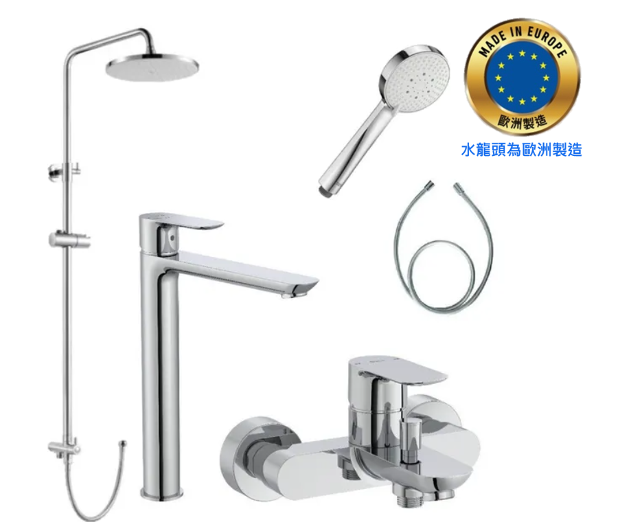 | 型號 | 高身面盆龍頭:A5A346EC00 (歐洲) 掛牆式浴缸龍頭:A5A026EC00 (歐洲) 圓形淋浴柱:A5B5450C0N (中國) 手持花灑:A5BG113C0N (中國) 花灑喉:A5B2515C0N (中國) |